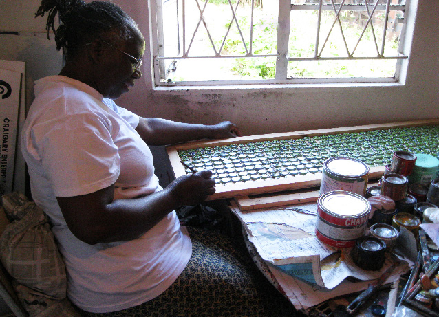 使用済の王冠に人々の暮らしや動物の絵を描き、バッジ、マグネット、ピアスを制作。大きなものは、王冠を叩いて平らにして使っています。