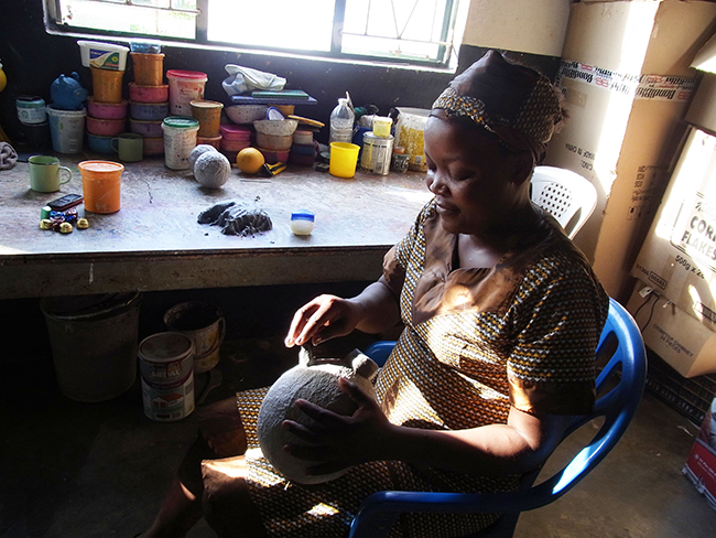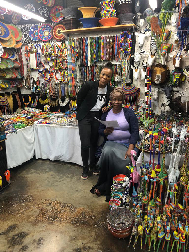 写真右側で椅子に腰かけるのがステラさん。ヨハネスブルクのマーケットで、細かなビーズをたっぷり使ったゴージャスなネックレスを制作。